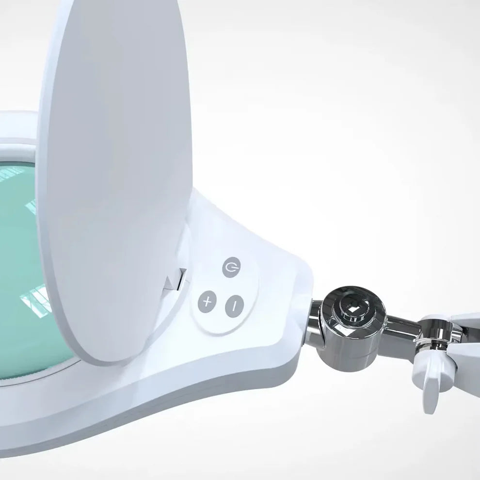 מנורת SMD LED מקצועית עם זכוכית מגדלת בקוטר 152 מ״מ, תופסן (קלאמפ) לשולחן וזרוע יציבה במיוחד לכיוון מדויק של גובה וזווית. התאורה בהירה, יציבה ואחידה – עם הפחתת השתקפויות – והשילוב עם העדשה המגדילה מאפשר לראות פרטים זעירים בדיוק גבוה. פתרון אידיאלי לסלון יופי, משרד ומעבדה.